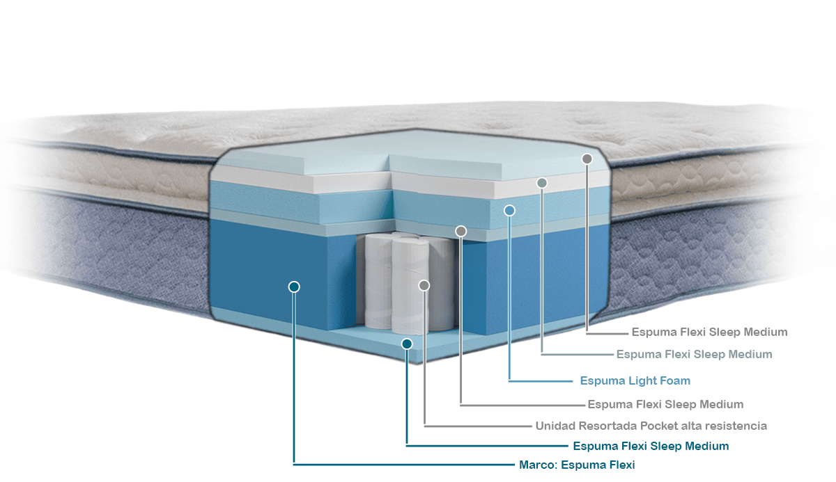• La combinación de espumas y Pillow Top genera una sensación de confort envolvente, aportando firmeza y comodidad sin sacrificar ligereza
